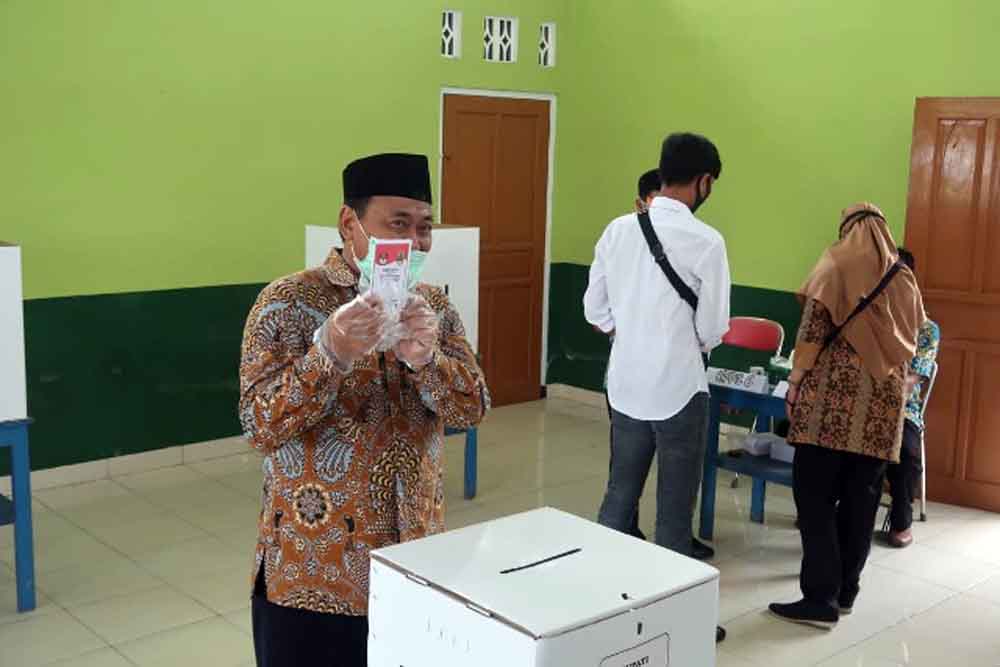 Joko Santosa, cabup Paslon nomor urut 2 Joko Santosa-Wiwaha Aji Santosa (Joswi), memberikan hak suaranya di TPS 14 Gumpang, Kartasura.