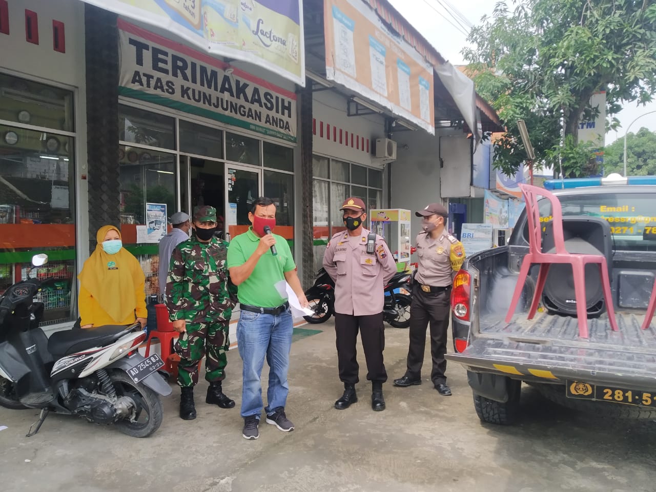 Muspimcam Plupuh juga singgah di Minimarket Sari Makmur di Dukuh Mrakean, Desa Sambirejo, Kecamatan Plupuh menyosialisasikan PSBB.