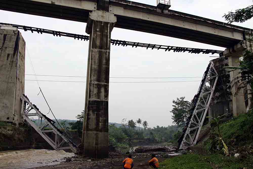 Akibatnya, Johari menambahkan, badan jembatan dari kerangka besi penyangga rel sepanjang 50 meter ini jatuh ke sungai. Jembatan ini hanya menyisakan rel yang menggantung di atas sungai.