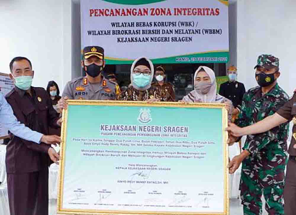 PEMERINTAH Kabupaten (Pemkab) Sragen mengapresiasi langkah Kejaksaan Negeri (Kejari) Sragen, yang mencanangkan Zona Integritas Wilayah Bebas Korupsi (WBK) dan Wilayah Birokrasi Bersih Melayani (WBBM).