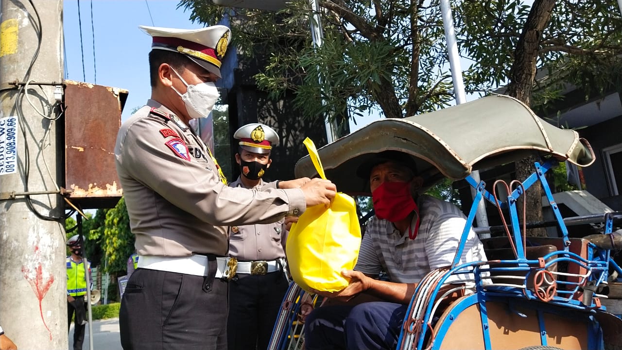 Seperti yang dilakukan ketika memimpin kegiatan Operasi Keselamatan Lalu Lintas Candi 2021 di kawasan Simpang Empat Karangjati dan di Blok T, Jumat (16/4/2021), tiba-tiba Kasat Lantas langsung menghampiri pemulung dan tukang becak yang berada di lokasi.