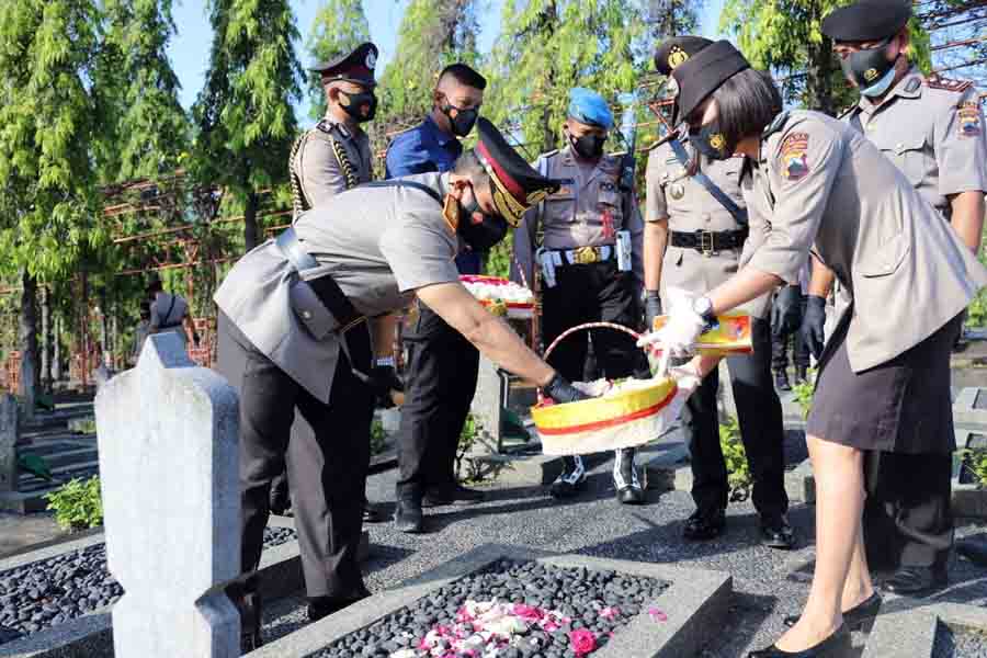 MEMPERINGATI Hari Bhayangkara Ke-75, Polda Jateng melaksanakan serangkaian acara, di antaranya upacara ziarah ke Taman Makam Pahlawan (TMP) Giri Tunggal, Kota Semarang. Selasa (29/6/2021), pukul 09.00.