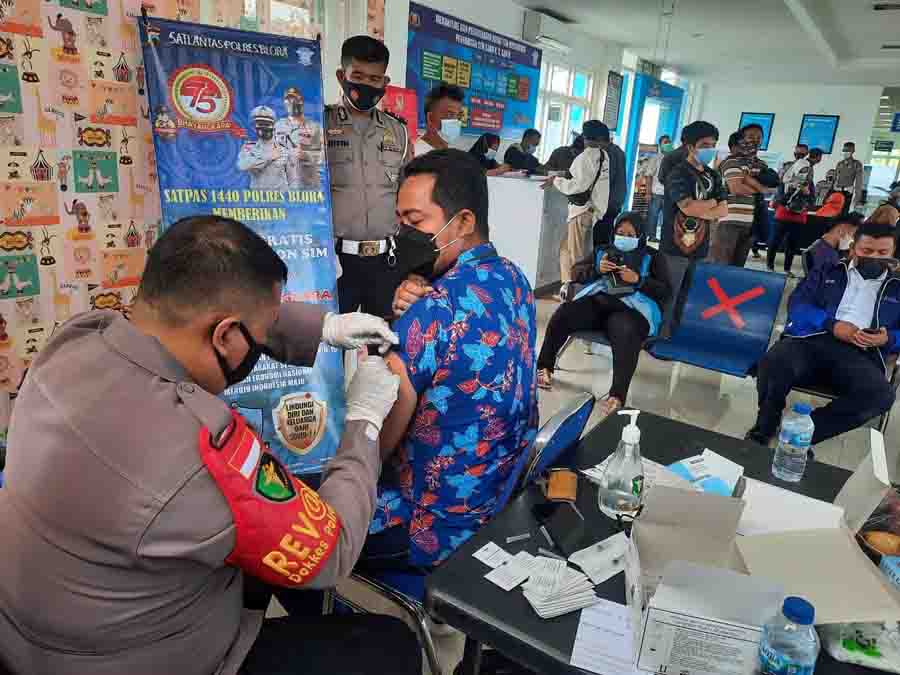SATUAN Lalu Lintas (Satlantas) Polres Blora menggelar kegiatan vaksinasi gratis kepada para pemohon SIM, Kamis (1/7/2021). Setidaknya ada 180 pemohon SIM dan warga sekitar kantor Satpas SIM mendapat vaksinasi gratis.