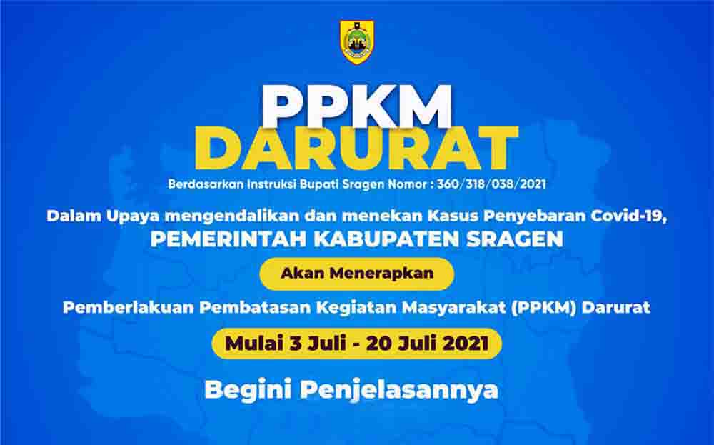 BUPATI Sragen resmi menerbitkan Instruksi Bupati (Inbup) No.360/318/038/2021 tentang Pemberlakuan Pembatasan Kegiatan Masyarakat (PPKM) pada Kondisi Darurat Covid-19 di Kabupaten Sragen.
