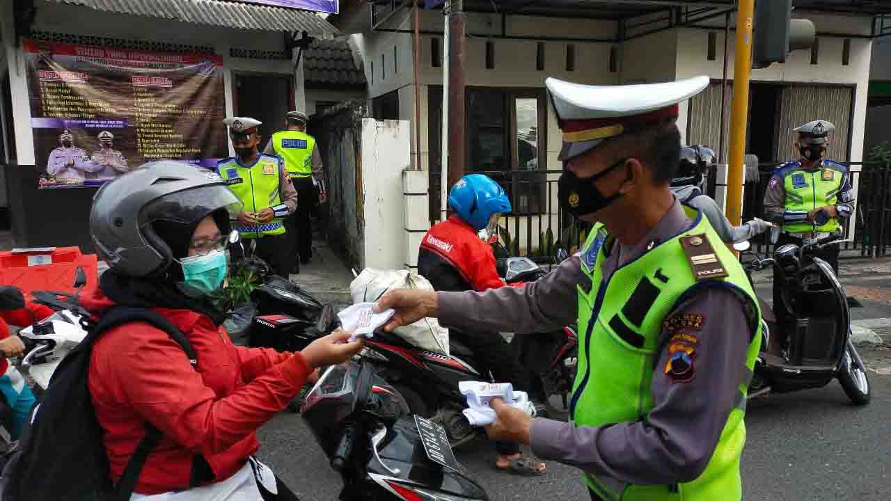 Petugas Satlantas Polres Blora melakukan sosialisasi dan edukasi dengan cara membagikan masker gratis dan stiker disiplin protokol dalam rangka penerapan PPKM Darurat kepada warga yang melintas di depan Pos Cek Point PPKM Darurat di Simpang Empat Biandono.
