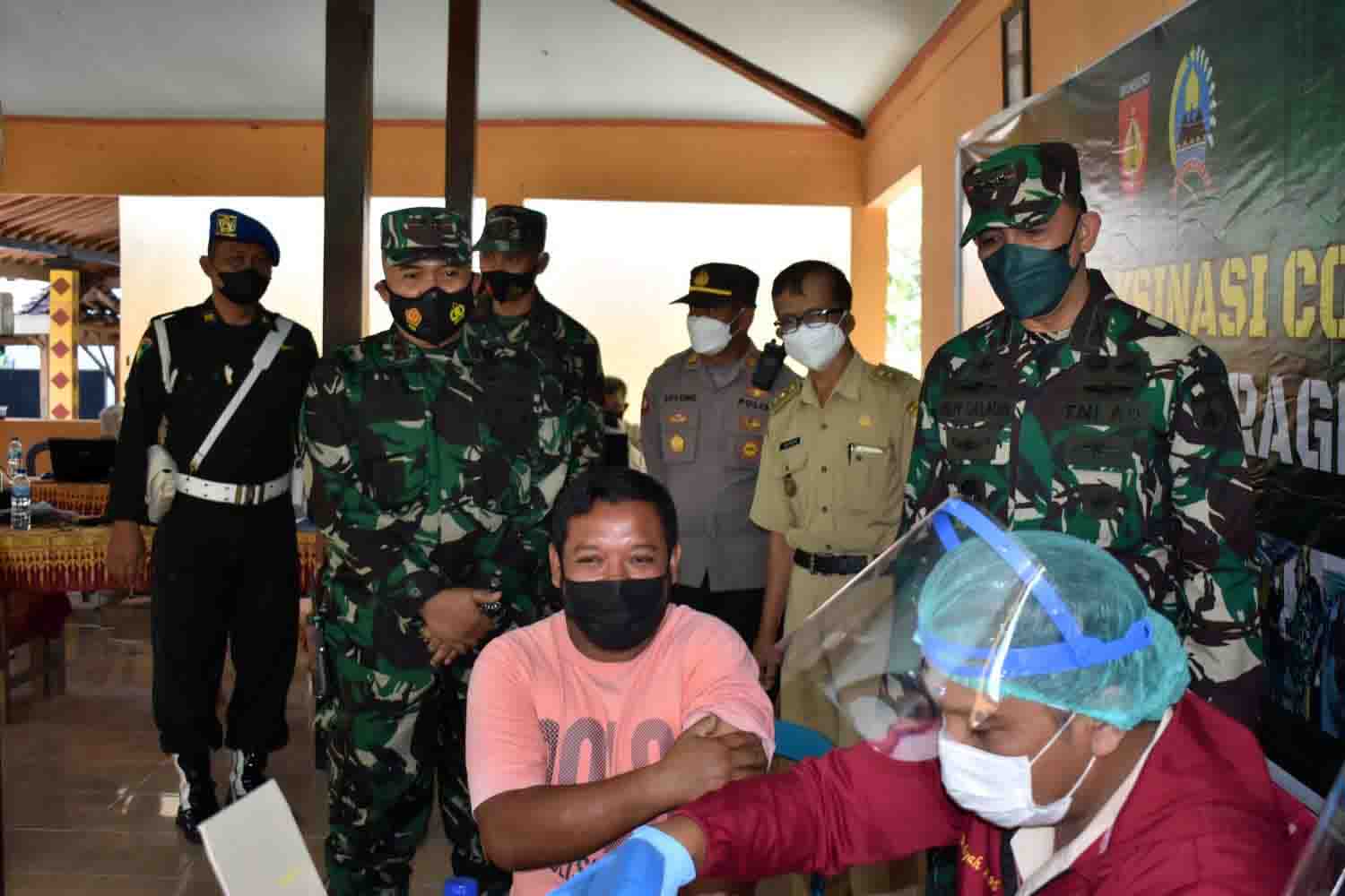 KODIM 0725/Sragen bekerja sama dengan Yayasan Tunas Amaliah Berlian Center di bawah naungan PT Bayu Berlian Makmur menggelar serbuan vaksinasi untuk masyarakat umum usia 18 tahun ke atas di Balai Desa Geneng, Kecamatan Miri, Kabupaten Sragen, Senin (20/9/2021).