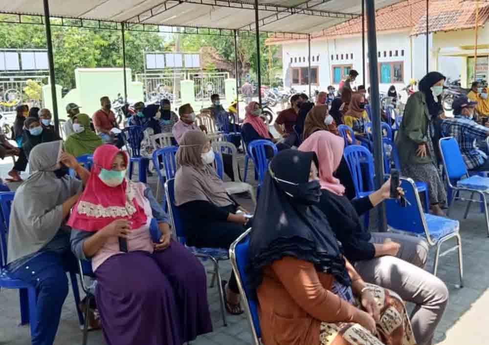 ANTREN warga peserta vaksinasi di Balai Desa Karangwaru.