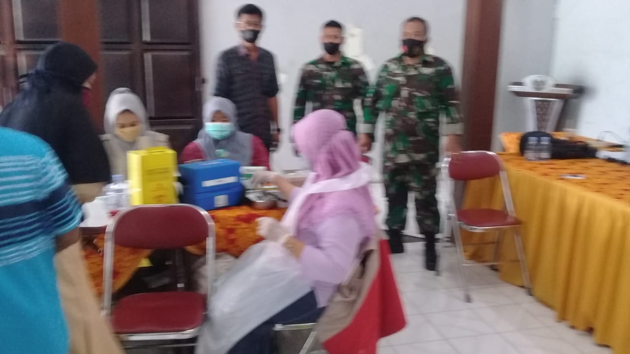 KEPALA Desa Dari Rinduwan didampingi dua anggota Koramil 20/Plupuh di tengah-tengah para tenaga kesehatan (nakes) yang melayani peserta vaksinasi di Balai Desa Dari, Selasa (5/10/2021).
