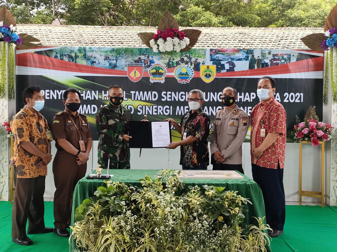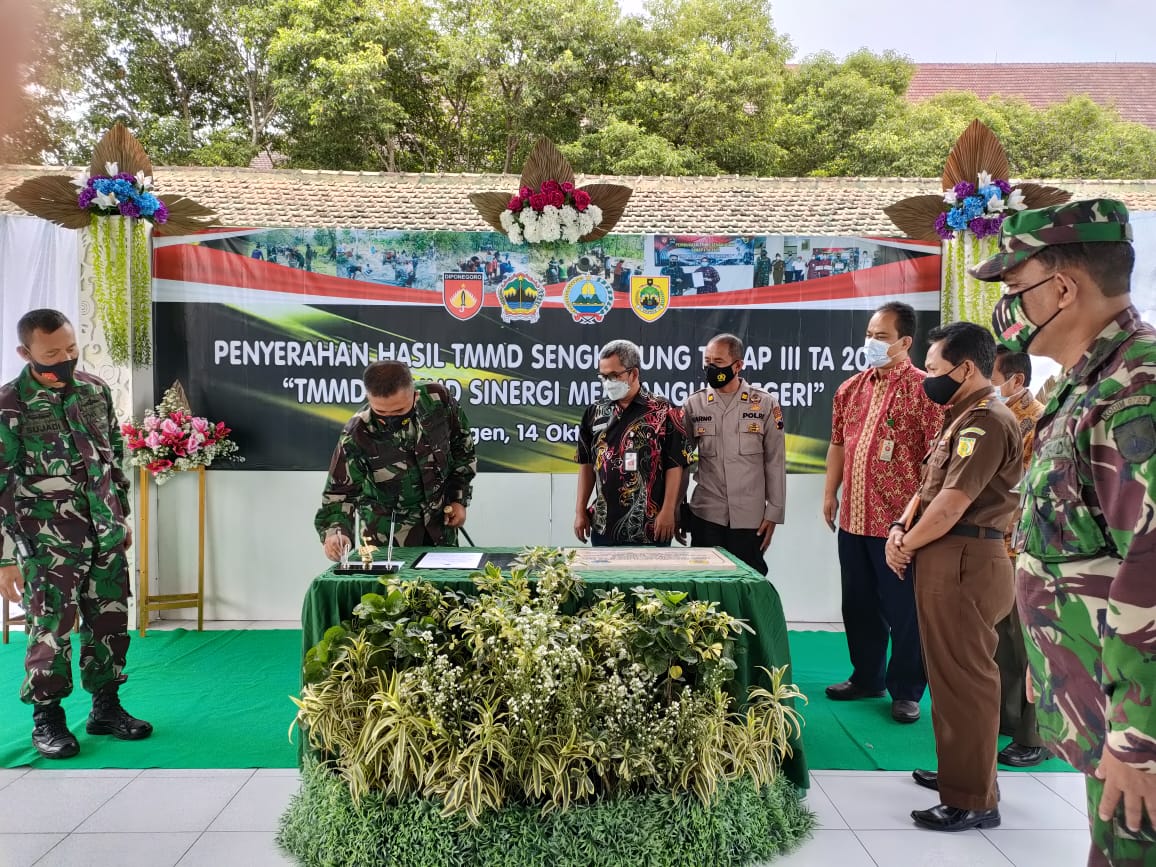 Penyerahan hasil TMMD Sengkuyung tahap III Tahun Anggaran (TA) 2021 Kepada Bupati Sragen ini ditandai dngan upacara penandatanganan naskah dan penyerahan hasil TMMD Sengkuyung tahap III dari Dandim 0725/Sragen Letkol (Inf) Anggoro Heri Pratikno kepada Bupati diwakili Sekretaris Daerah ( Sekda) Sragen . Tatag Prabawanto.