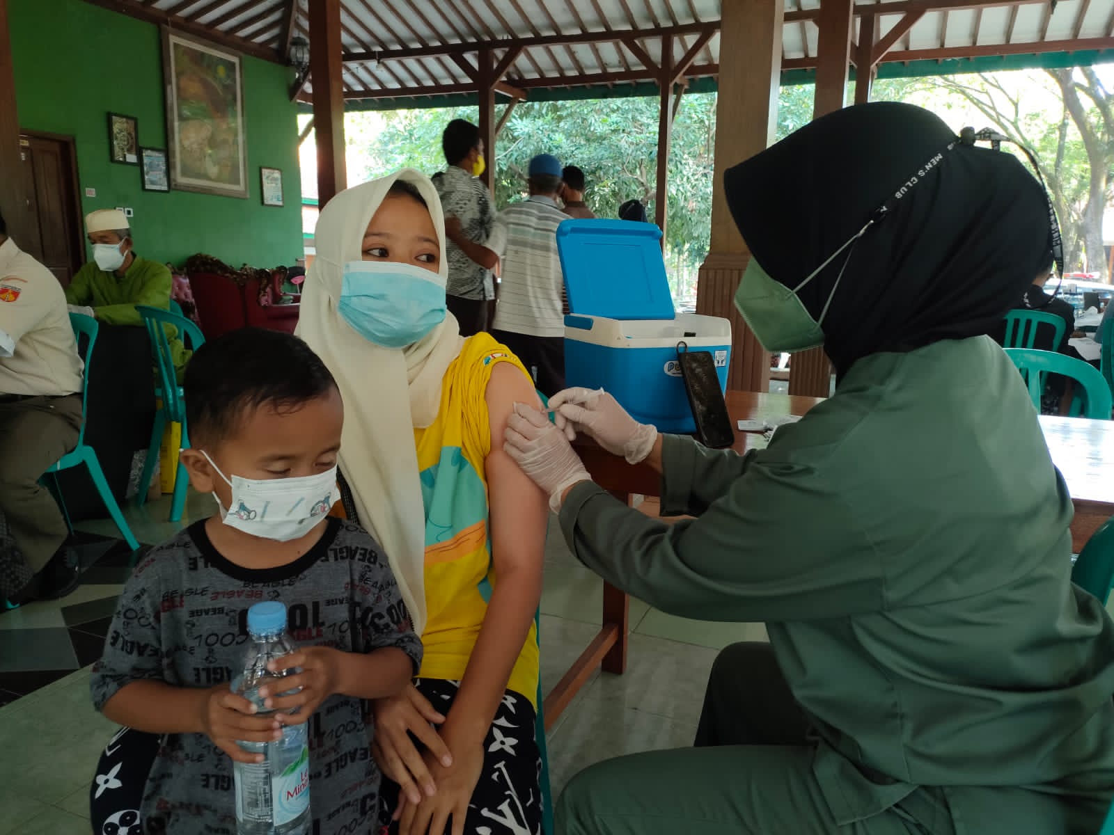 Serbuan Vaksinasi Covid-19 yang diprakarsai Danramil 02/Karangmalang Kapten (Inf) Prihatin Yudho di Ndayu Park ini di hadiri Kasdim 0725/ Sragen Mayor (Inf) Wijiono, Camat Karangmalang Kurniawan Sukowati, Kaposkes Pratama Kartika 25/Sragen Lettu Ckm drg Willy Prayudisti beserta tim vaksinator, Pasandi Lettu Ctp May Indra Purnomo. ( Sugimin/17)