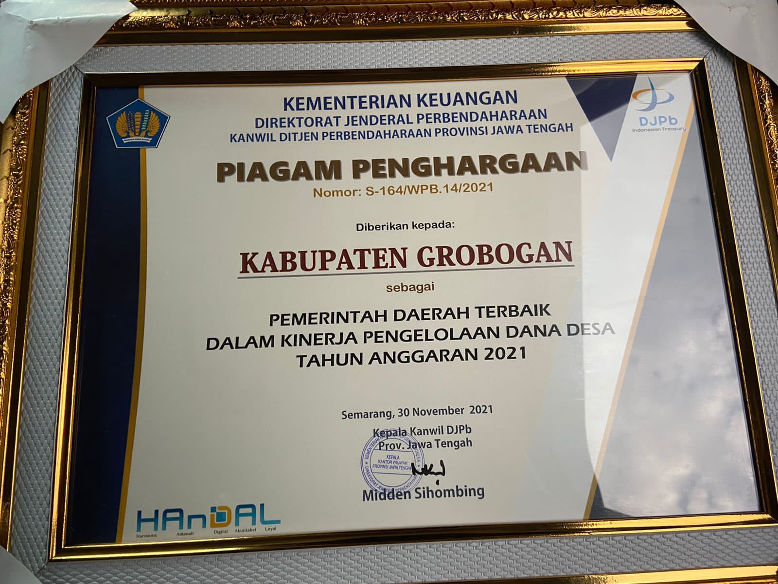 Bupati menerima piagam tersebut dalam acara Penyerahan Daftar Isian Pelaksanaan Anggaran (DIPA) dan Daftar Alokasi Transfer ke Daersh dan Dana Desa Jawa Tengah Tahun Anggaran 2022. Hadir dalam acara itu Gubernur Jateng Ganjar Pranowo beserta Forkompinda Jateng, Kepala Kanwil Ditjen Perbendaharaan Jateng Miden Sihombing, Bupati/Walikota se Jateng, para Kuasa Pengguna Anggaran K/L Jateng dan undangan lainnya.