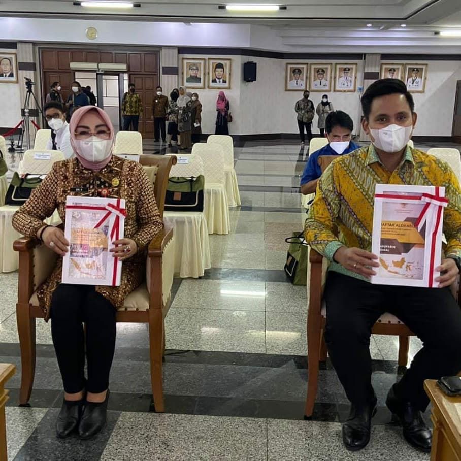Bupati Grobogan Hj Sri Sumarni SH MM atas nama Pemkab Grobogan menerima piagam penghargaan sebagai Kabupaten Terbaik dalam Kinerja Pengelolaan Dana Desa tahun anggaran 2021 dari Kanwil Ditjen Perbendaharaan Jateng di gedung Gradika Bhakti Praja Pemprop Jateng di Semarang, Kamis (9/12/21)