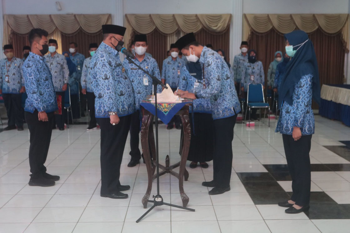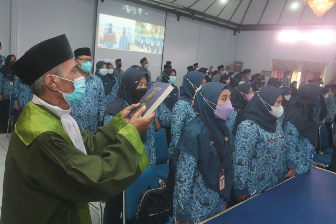 Tegal-Inspirasiline.com. Sebanyak 194 Calon Pegawai Negeri Sipil (CPNS) formasi pengadaan 2019 dan 8 PNS yang belum disumpah sebelumnya di Lingkungan Pemerintah Kota Tegal, resmi diambil sumpah janji Pegawai Negeri Sipil (PNS) pada Kamis (17/2/2022) di Ruang Adipura dan Pendopo Ki Gede Sebayu Komplek Balai Kota Tegal.
