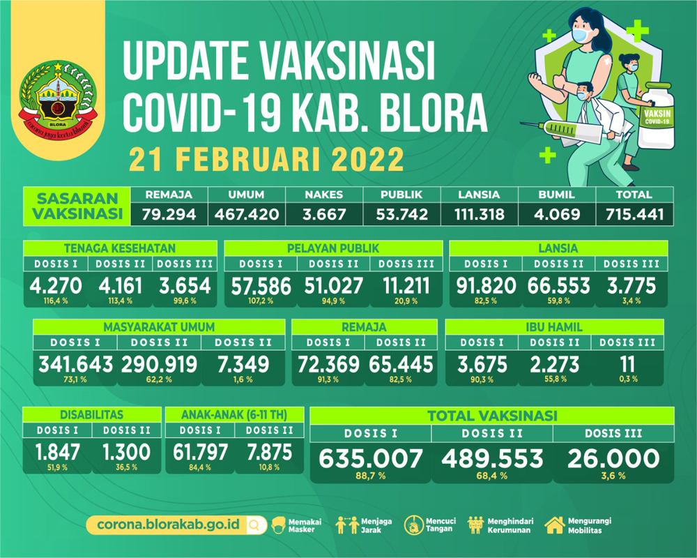 Sementara itu berdasarkan update vaksinasi Covid-19 Kabupaten Blora, Senin (21/2/2022) total vaksinanasi dosis I sebanyak 635.007, dosis II 489.553, dan dosis III 26.000.