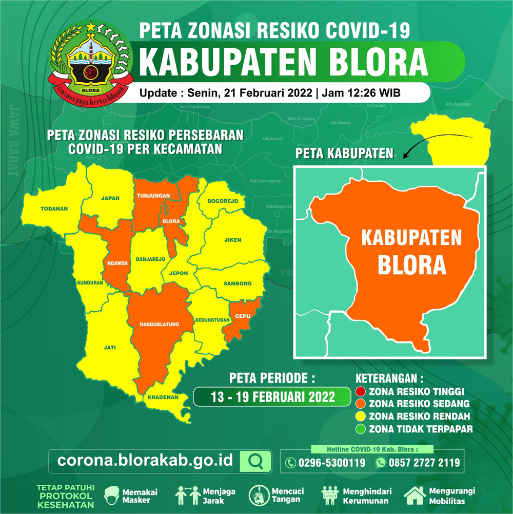 Blora-Inspirasiline.com. Lima Kecamatan di Kabupaten Blora masuk kategori zona risiko sedang (orange) persebaran Covid-19. Kelimanya adalah kecamatan Tunjungan, Blora, Ngawen, Randublatung dan Cepu. Sedangkan kecamatan lainnya masuk kategori zona kuning (risiko rendah). Untuk tingkat Jawa Tengah, Kabupaten Blora masuk kategori zona orange.