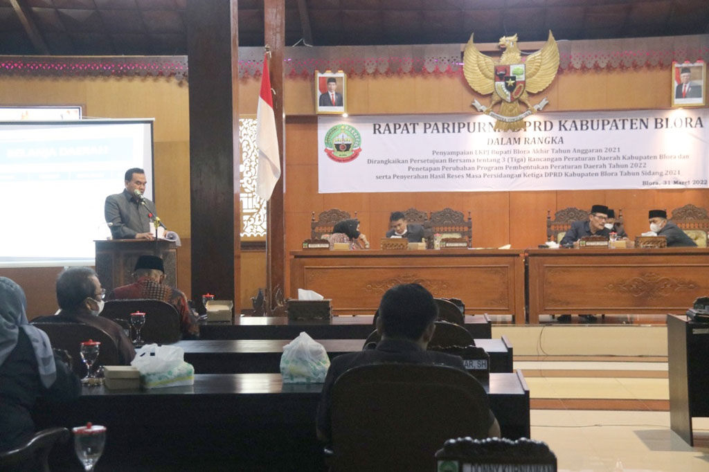 Blora-Inspirasiline.com. Bupati Blora H. Arief Rohman, S.IP, M.Si, bersama dengan Wakil Bupati Blora Tri Yuli Setyowati, ST., MM pada Kamis (31/3/2022) menyampaikan Laporan Keterangan Pertanggungjawaban (LKPj) Bupati Blora Akhir Tahun Anggaran 2021 dalam Rapat Paripurna DPRD Kabupaten Blora.