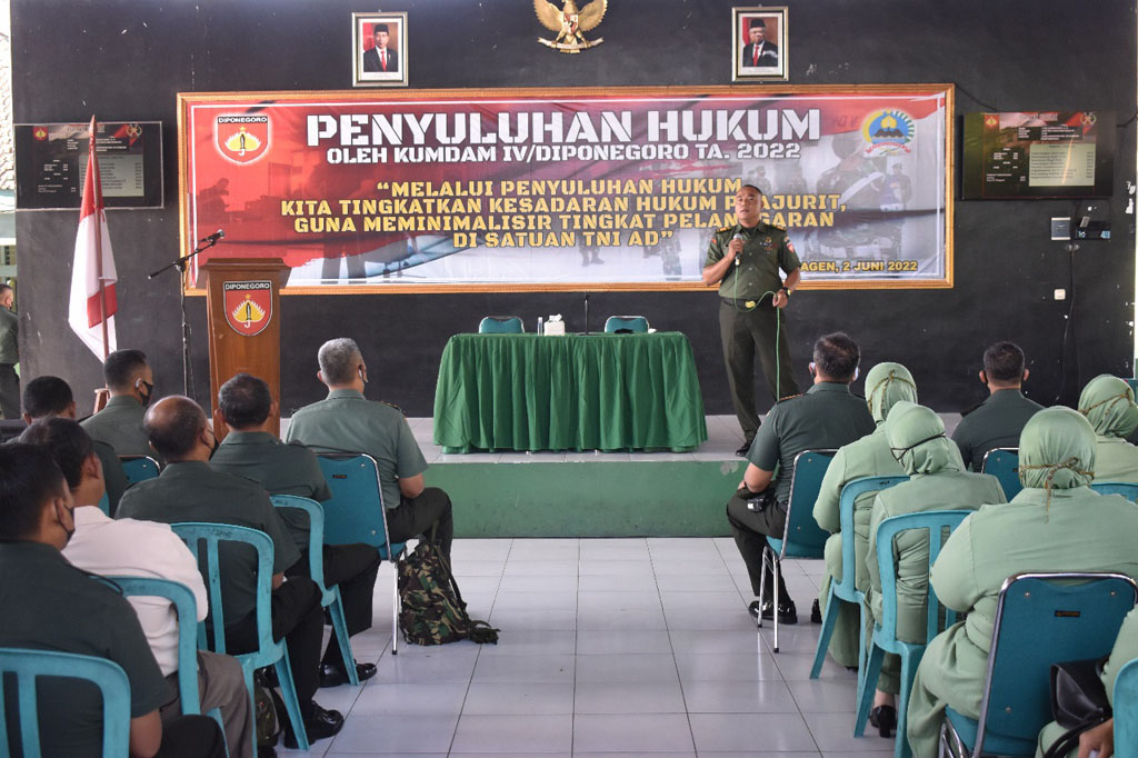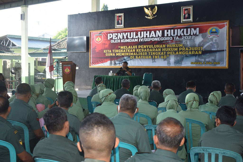 Sragen-Inspirasiline.com. Ratusan Prajurit Tentara Nasional Indonesia (TNI), Pegawai Negeri Sipil (PNS) dan  Persatuan Isteri Prajurit (Persit) Kodim 0725/Sragen Mendapatkan penyuluhan hukum dari Kumdam IV/Diponegoro di Makodim 0725/Sragen Kamis (2/6/2022).