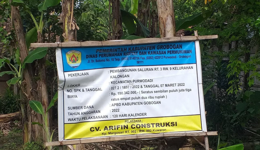 Proyek senilai Rp.190 juta kebih bersumber dari dana APBD Grobogan tahun 2022 tersebut dikerjakan oleh CV Arifin Construksi beralamat di Kwaron Gubug Kab.Grobogan. Target waktu penyelesaian proyek saluran yang ditentukan adalah selama 4 bulan sejak bulan Maret yang lalu. Namun berdasarkan pengamatan warga setempat, proyek Disperakim Grobogan itu terkesan tergesa gesa, sehibgga bangunan belum jadi semuanya sudah pada retak retak.”Bangunan belum selesai semuanya kok sudah retak, gimana pengawasannya itu” beber Bambang warga setempat.