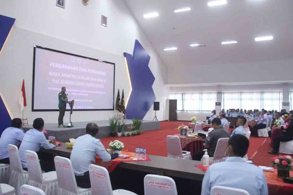 Bertempat di Aula Lapas Kelas IIA Super Maksimum Security Karanganyar, Kakanwil, A. Yuspahruddin, beserta Kadiv Administrasi, Jusman, dan Kadiv Pemasyarakatan, Supriyanto, turut hadir pada pengarahan Wamenkumham.