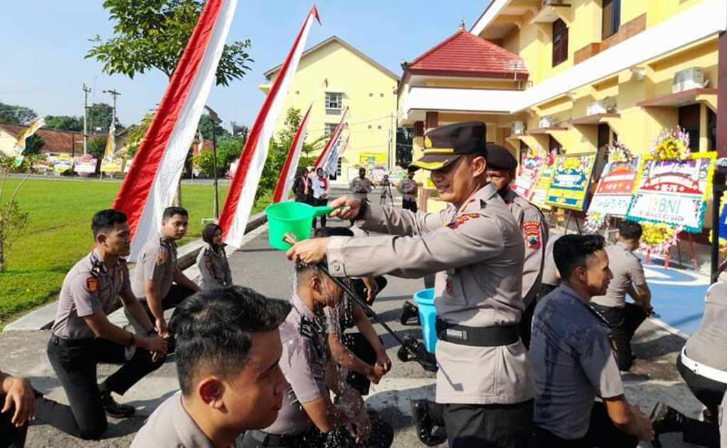 AKBP Piter Yanottama mengguyur mereka satu per satu dengan menggunakan gayung yang diikuti para Bhayangkari dan perwira lainnya.