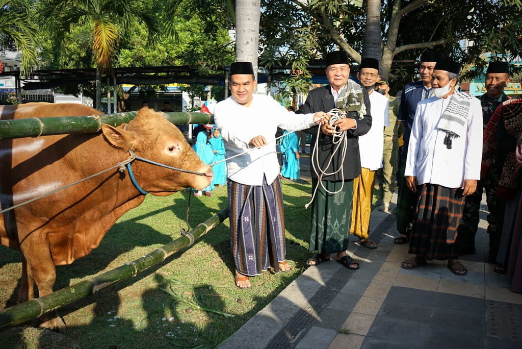 “Bismillah pagi ini kita serahkan satu ekor sapi kepada Takmir Masjid Agung Baitunnur untuk disembelih dan dibagikan kepada masyarakat yang membutuhkan. Semoga berkah dan bermanfaat,” ujar Bupati Arief.