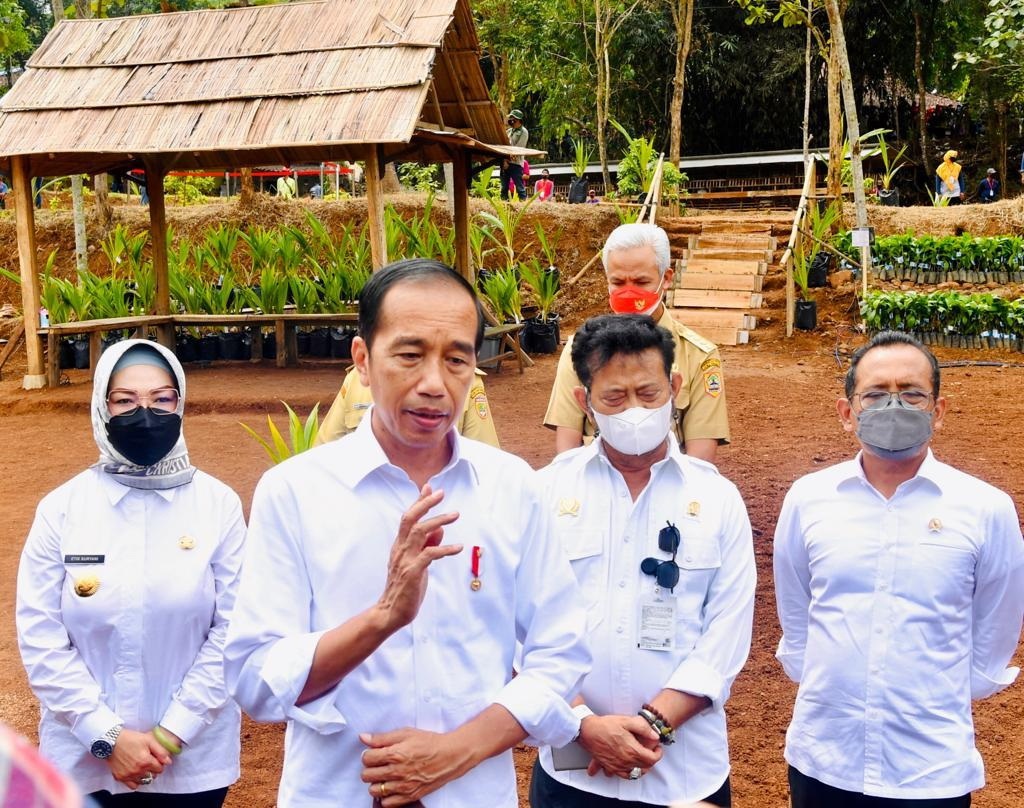 Sukoharjo-Inspirasiline.com. Presiden Republik Indonesia Joko Widodo didampingi ibu negara Iriana Jokowi, Mentan Syahrul Yasin Limpo (SYL), Gubernur Jawa Tenganh Ganjar Pranowo, bupati Sukoharjo Etik Suryani melakukan melakukan penanaman kelapa genjah di dukuh Samin Desa Sanggang Kecamatan Bulu, Sukoharjo, Kamis (11/08/2022).