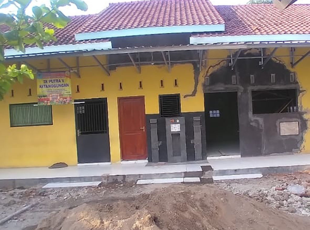 Brebes-Inspirasiline.com. TK Putra V Ketanggungan Kabupaten Brebes, yang beberapa waktu lalu tertabrak truk molen semen, yang mengalami rem blong di turunan flyover Dermoleng Ketanggungan, kini tengah dibangun kembali oleh Perusahaan pemilik truk molen semen tersebut. Ruang kelas yang jebol dibangun kembali, serta pagar tembok depan sekolah yang ambruk juga dibangun dengan permanen.