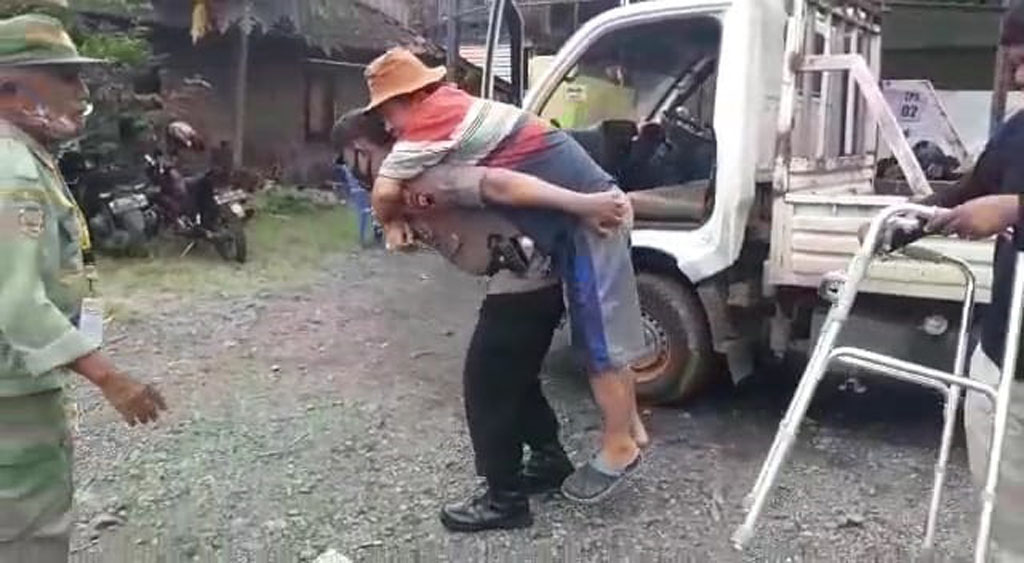Anggota Polsek Kangkung bersama Babinsa bantu warga yang menderita sakit stroke untuk datang ke TPS, untuk menggunakan hak suaranya pada Pemilihan kades serentak tahun 2022 di Kabupaten Kendal.