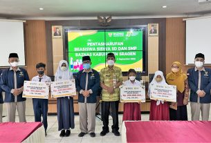 Penyerahan bantuan dilakukan oleh Kapolres Grobogan dan Ketua Bhayangkari serta diberangkatkan atau dilepas ditandai dengan kibasan bendeta start. (jkwi)