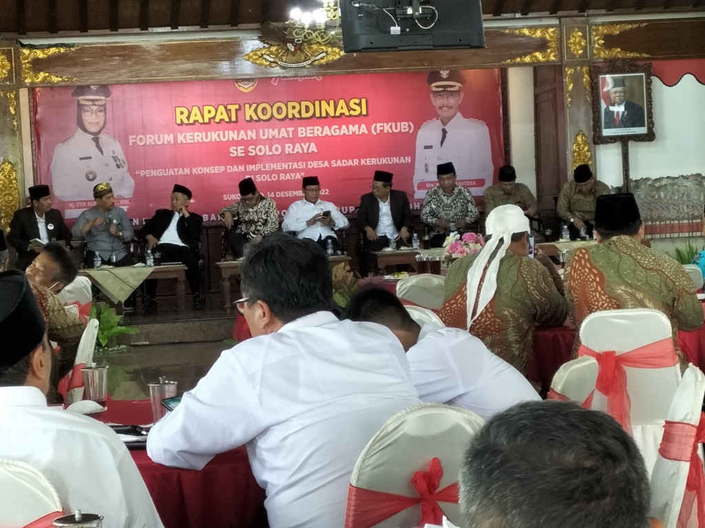 Sukoharjo-Inspirasiline.com. Rapat Koordinasi (Rakor) Farum Komunkasi Umat Beragama (FKUB) se Solo Raya yang bertempat di pendopo Graha Satya Praja (GSP) Pemkab Sukoharjo pada Rabu (14/12/2022) yang dihadiri oleh ketua FKUB propinsi Jateng dan perwakilan FKUB dari masing-masing kabupaten/kota se Solo Raya.