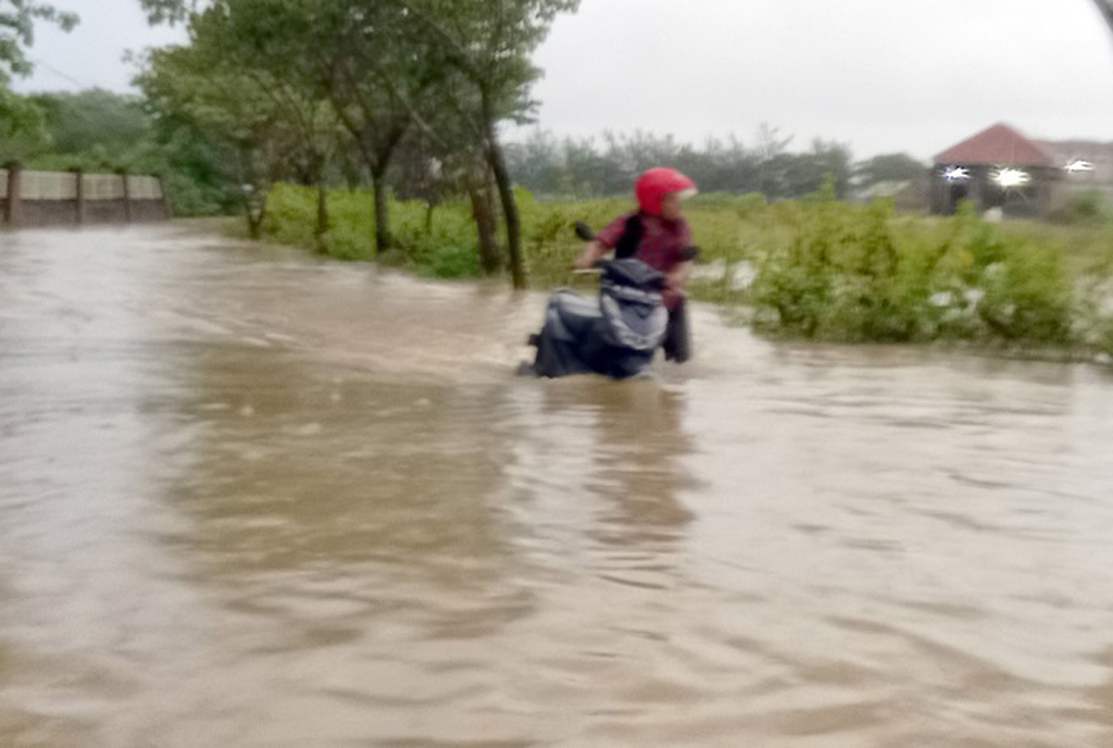 Air dari saluran tersebut pun meluap ke area jalan. Apa lagi kawasan tersebut agaknrendah, sehingga terjadi genangan. Beberapa sepeda motor nampak terparkir di lokasi tersebut. Beberapa pengendara yang nekat menerjang terpaksa harus menuntun. Sebab, ketinggian air sudah sampai knalpot.