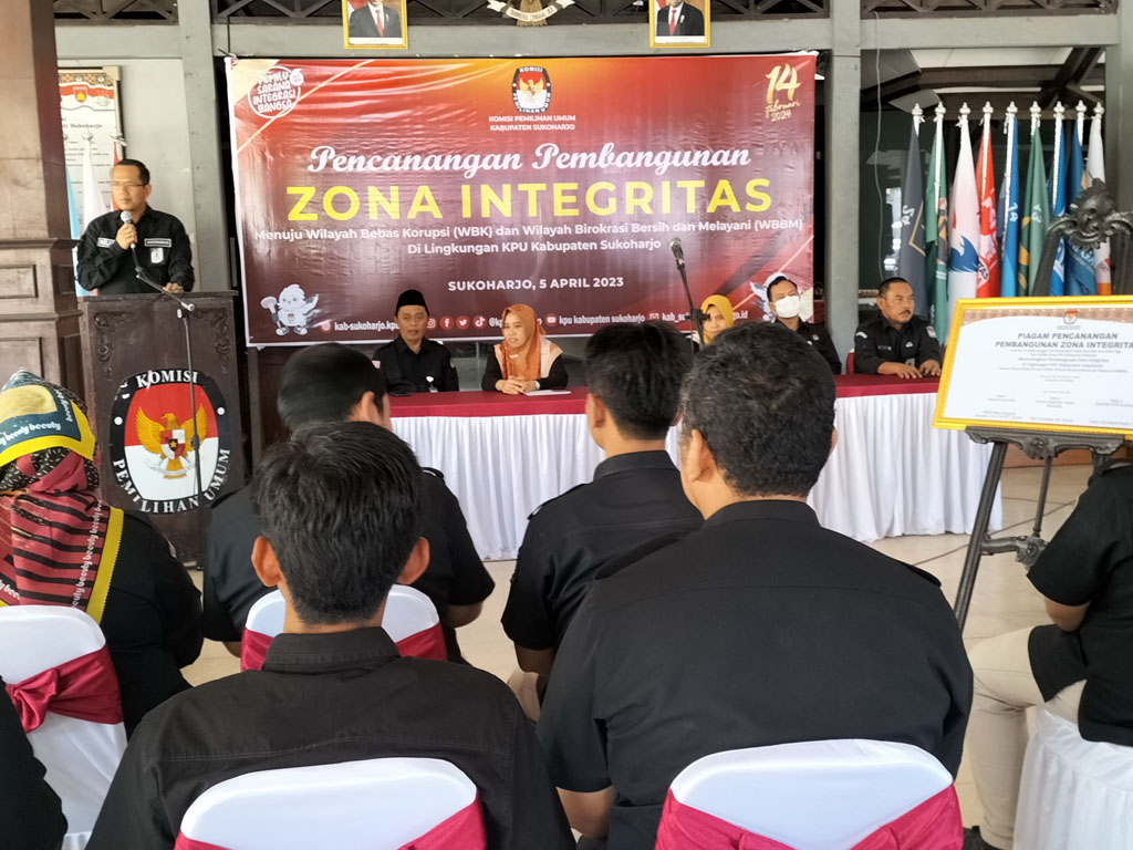 Sukoharjo-Inspirasiline.com. Dalam rangka untuk mewujudkan program reformasi birokrasi dalam mengembangkan budaya kerja yang anti korupsi, berkinerja tinggi, dan memberikan pelayanan publik yang berkualitas, Komisi Pemilihan Umum (KPU) Kabupaten Sukoharjo  mencanangkan pembangunan zona integritas menuju Wilayah Bebas Korupsi (WBK) dan Wilayah Birokrasi Bersih Melayani (WBBM) di lingkungan kerja KPU Kabupaten Sukoharjo, kegiatan tersebut berlangsung Rabu (5/4/2023) di pendopo kantor KPU.