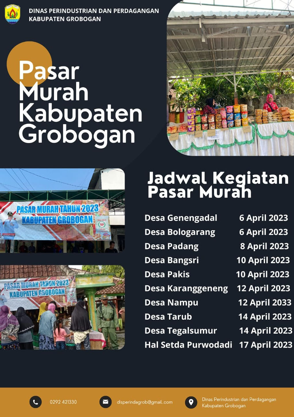 “Dalam rangka menjelang Lebaran ini, kami menggelar pasar murah di 10 lokasi dengan menyediakan bahan bahan kebutuhan pokok dengan harga jauh lebih murah” kata Danis, panggilan akrab Kadisperindag Grobogan itu.
