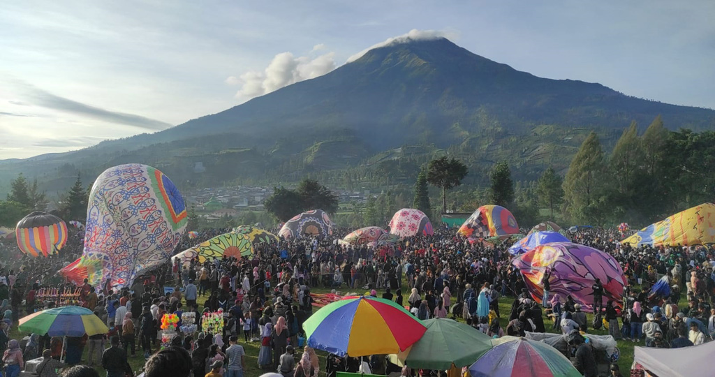 Temanggung-Inspirasiline.com. Ribuan warga tumpah ruah menyaksikan festival balon udara, yang dilaksanakan di lapangan Desa Kledung Kabupaten Temanggung Jawa Tengah. Balon raksasa yang diterbangkan saat Festival tersebut bermotif batik dan di lombakan dengan penilaian sesuai ketentuan panitia. Gelar tradisi tersebut berlangsung di Wonosobo dan Kledung Temanggung 26 – 29 April 2023.