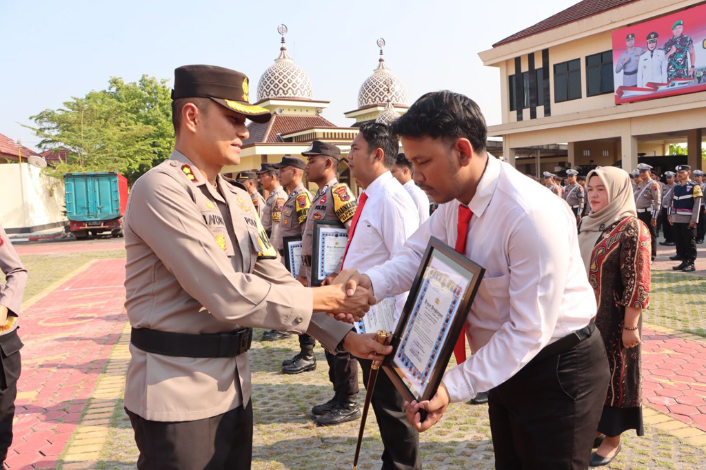 Grobogan-Inspirasiline.com. Setidaknya ada 10 Anggota kepolisian, 2 institusi dan 2 masyarakat Kabupaten Grobogan menerima penghargaan dari Kapolres Grobogan AKBP Dedy Anung Kurniawan di halaman apel Mapolres Grobogan, Rabu (24/5/2023).