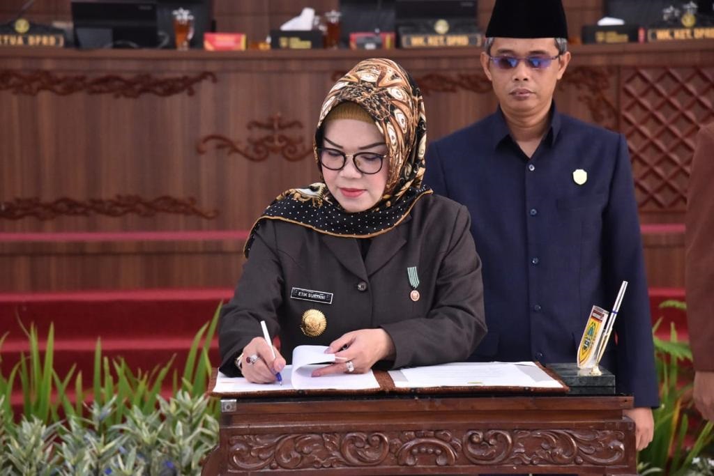 Sukoharjo-Inspirasiline.com. Bupati Sukoharjo, Etik Suryani bersama Wakil Bupati, Agus Santosa menghadiri Rapat Paripurna DPRD, Senin (10/7/2023).