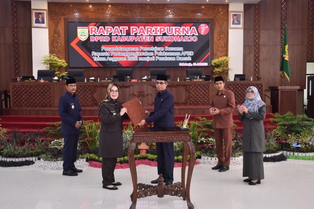 “Setelah mendengarkan Laporan dari Badan Anggaran DPRD, seraya mengucap ”Bismillahirrohmannirohim dan senantiasa memohon petunjuk kepada Alloh subhanahuwa ta’ala, maka saya dapat menyetujui Raperda Pertanggungjawaban Pelaksanaan Anggaran Pendapatan dan Belanja Daerah Kabupaten Sukoharjo Tahun Anggaran 2022 untuk ditetapkan menjadi Peraturan Daerah Kabupaten Sukoharjo,” ujar Bupati.