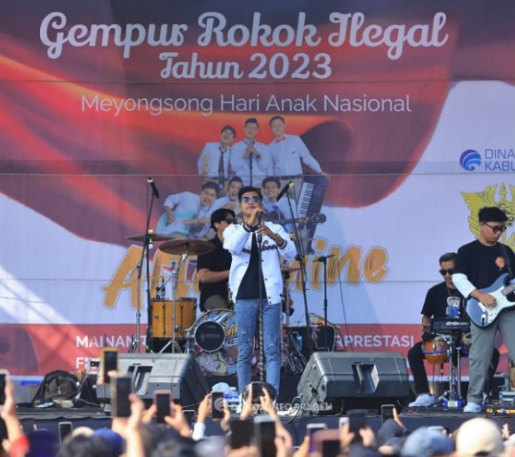 “Terimakasih Banyak Kepada Ibu Bupati Sragen yang sudah Menyelenggarakan Konser Gempur Rokok Ilegal Tahun 2023 dan Tadi Beliau Juga Berkesempatan Rawuh Disini.” Ungkap Vocalis Aftershine Hasan Sebelum Melanjutkan Lagu Tekan Semene.