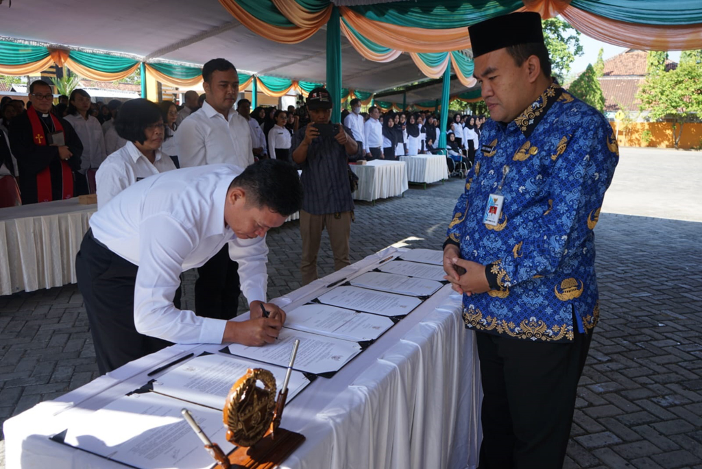 Para PPPK tersebut yang terdiri dari tenaga kependidikan, hingga tenaga teknis, merupakan formasi pengadaan tahun 2022, dilantik Bupati di halaman Dinas Pendidikan Blora. Bersamaan dengan itu dilakukan pengambilan sumpah janji dan penandatanganan kontrak kerja. Ikut menyaksikan, Plh. Kepala BKD, Asisten Administrasi Sekda Blora, dan Kepala OPD terkait.