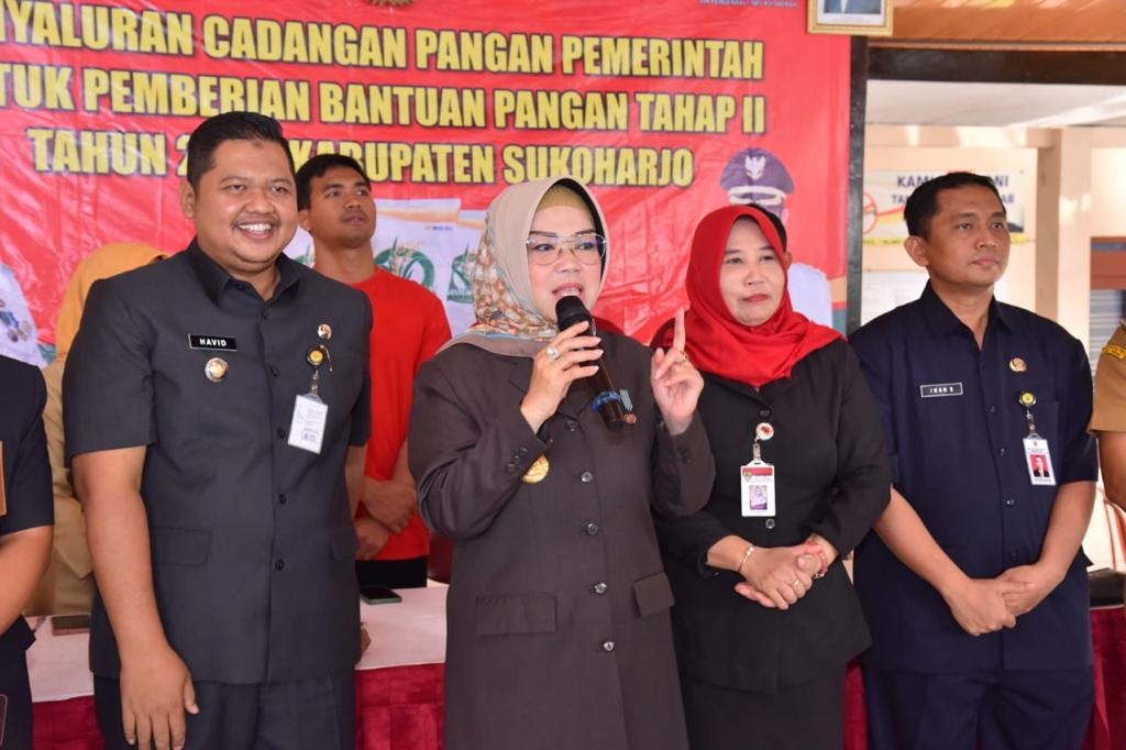Bupati Sukoharjo Etik Suryani meninjau secara langsung pembagian beras cadangan tahap ke-2 di Kalurahan Mandan Kecamatan Sukoharjo dan di Kecamatan Bendosari. Di sela-sela peninjauan pembagian beras bupati Etik kepada wartawan mengatakan bahwa hari ini kami bagikan beras cadangan tahap ke-2 secara serentak se Kabupaten yang mana setiap KK mendapatkan 10 kg beras kualitas medium.