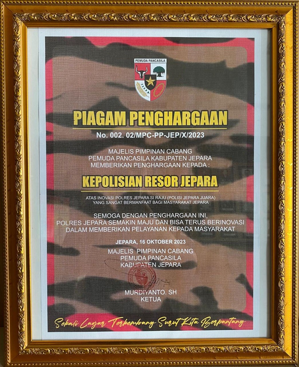 “Piagam Penghargaan ini kami berikan, dikarenakan Ormas Pemuda Pancasila sangat mengapresiasi aplikasi Siraju yang diinisiasi oleh Kapolres Jepara AKBP Wahyu Nugroho Setyawan. Inovasi ini memungkinkan masyarakat untuk membuat laporan secara online dengan cepat dan efisien, memberikan harapan bahwa laporan tersebut nantinya akan ditangani dengan cepat,” terangnya.