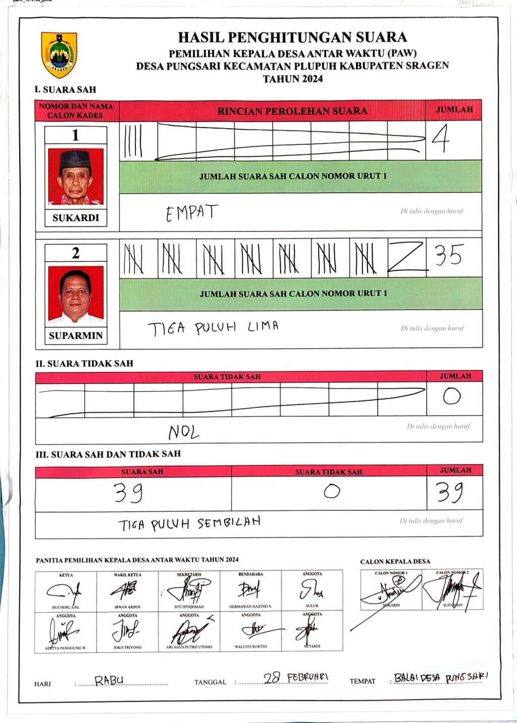 Pilkades Pungsari Diikuti Dua (2) Calon Yakni : Suparmin Dan Sukardi. Suparmin Mendapatkan 35 Suara dan Sukardi Mendapatkan 4 Suara.