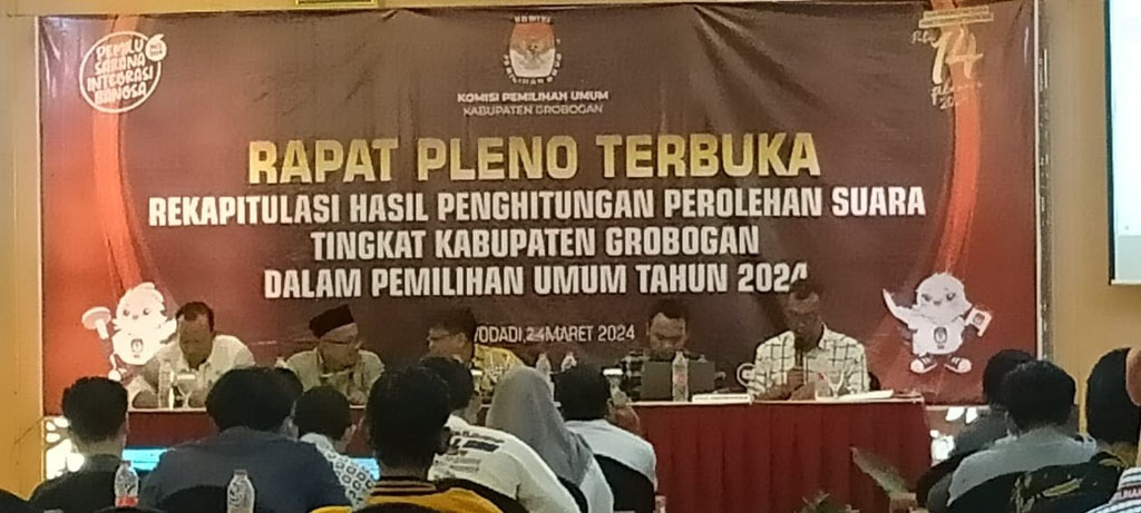 Grobogan-Inspirasiline.com. Komisi Pemilihan Umum Kabupaten Grobogan sejak Sabtu pagi (2/3/24) melakukan rekapitulasi perhitungan suara hasil Pemilu 2024 hingga berakhir tuntas pada Senin sore (4/3/24) yang berlangsung di Hotel 21 Purwodadi Grobogan.