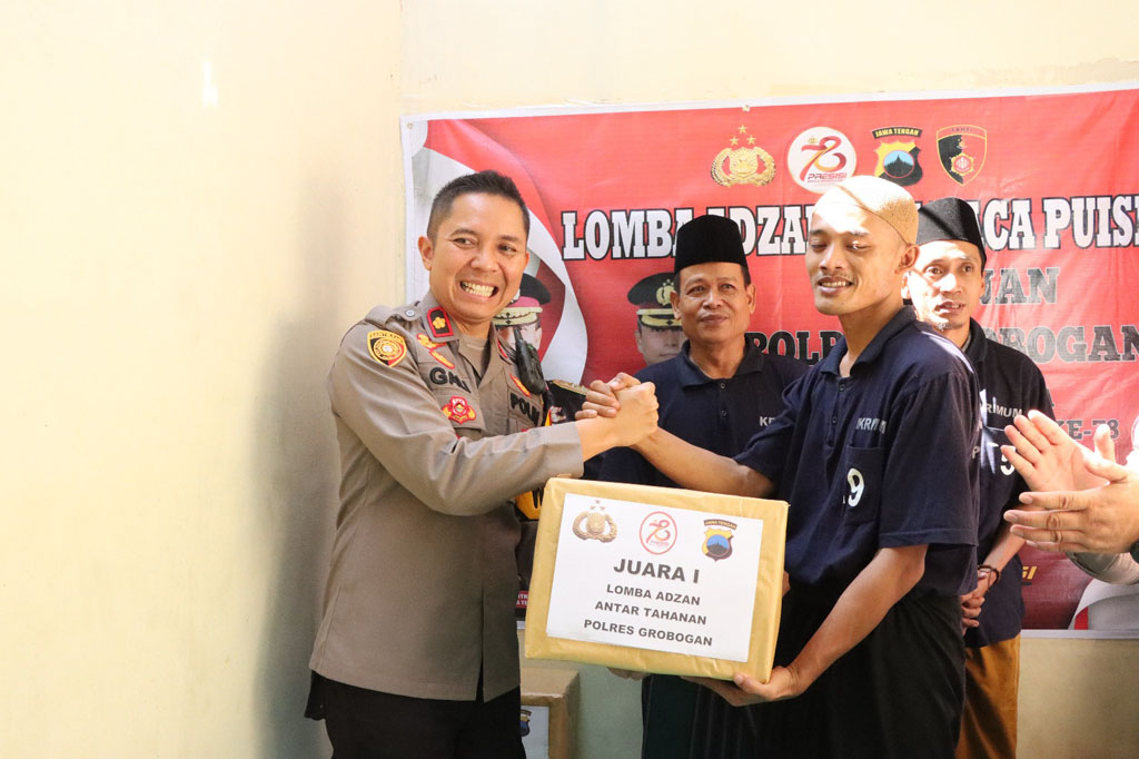 Dari 15 tahanan di Polres Grobogan, sebanyak tiga tahanan disahkan menjadi juara lomba azan dan tiga peserta menjadi juara lomba baca puisi. (jkwi)