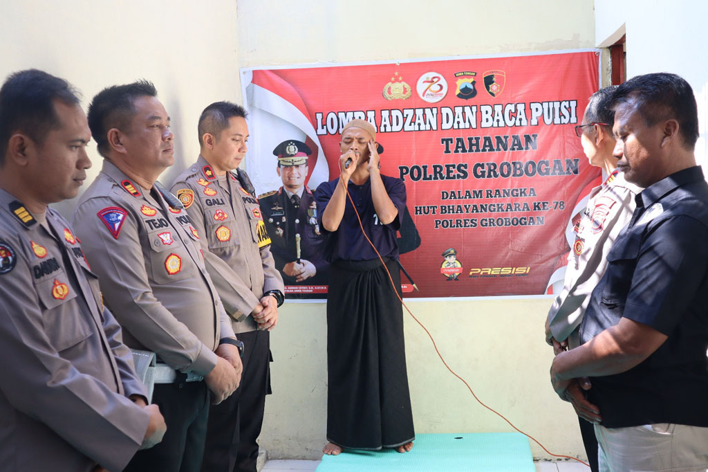 “Alhamdulillah, hari ini dalam rangka menyambut Hari Bhayangkara ke 78, kami dari Polres Grobogan mengadakan kegiatan lomba azan dengan para peserta adalah para tahanan yang sedang menjalani proses hukum di tahanan Mapolres Grobogan,” kata Kompol Gali Atmajaya.