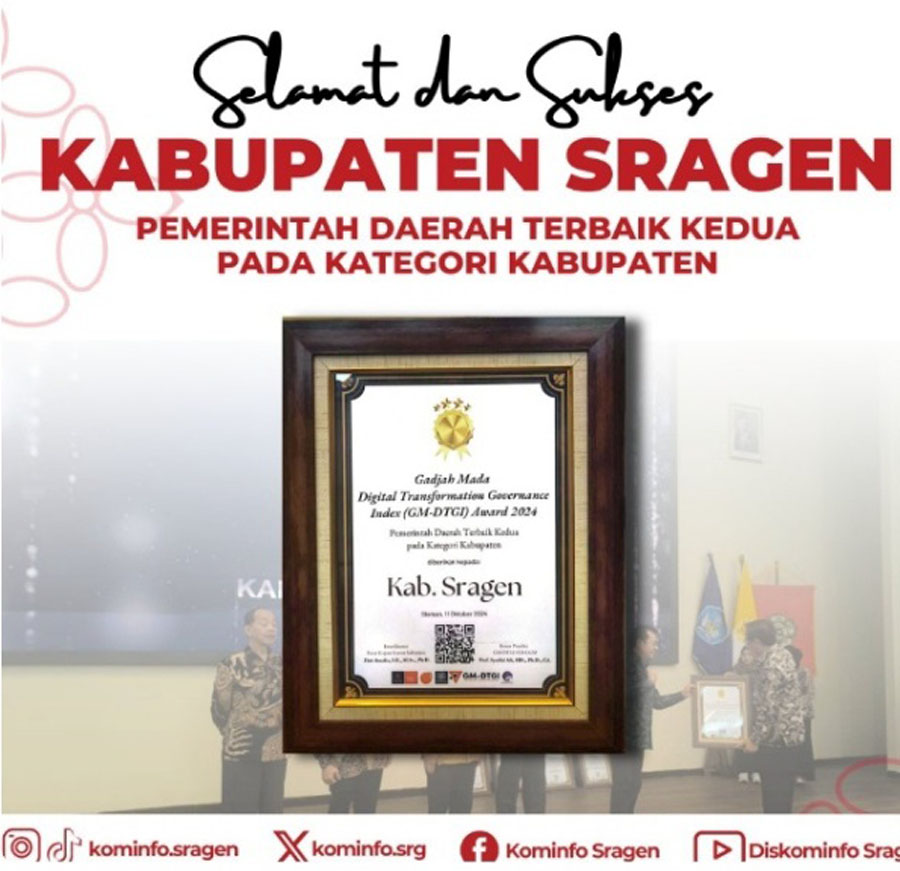 Sragen-Inspirasiline.com. Kabupaten Sragen Meraih Penghargaan Gajah Mada Digital Transformation Governance Index (GM-DTGI) Award 2024 Kategori Pemerintah Daerah Terbaik Kedua Pada Kategori Kabupaten Dari Gajah Mada Digital Transformation Governance Index (GM_DTGI) Yang Dihelat Di Auditorium Sukadji Ranuwihardjo MM FEB Universitas Gajah Mada Yogyakarta, Jumat (11/10/2024).