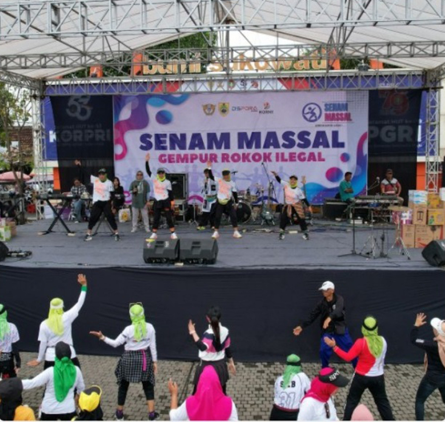 Sragen-Inspirasiline,com. Ratusan Warga Kabupaten Sragen berkumpul di Alun – Alun Sasono Langen Putro Sragen, Minggu (15/12/2024) pagi untuk mengikuti senam massal. Bukan hanya sekedar menyehatkan, senam massal kali ini juga sarat dengan pesan penting: perang memberantas Peredaran Rokok Ilegal yang berlangsung.