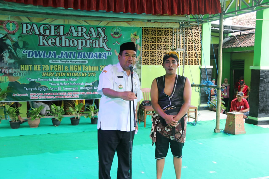 Bupati Blora, Dr. H. Arief Rohman hadir dan meresmikan grup kesenian Kesenian ketoprak para pendidik yang diberi nama “Dwija Jati Budaya”.
