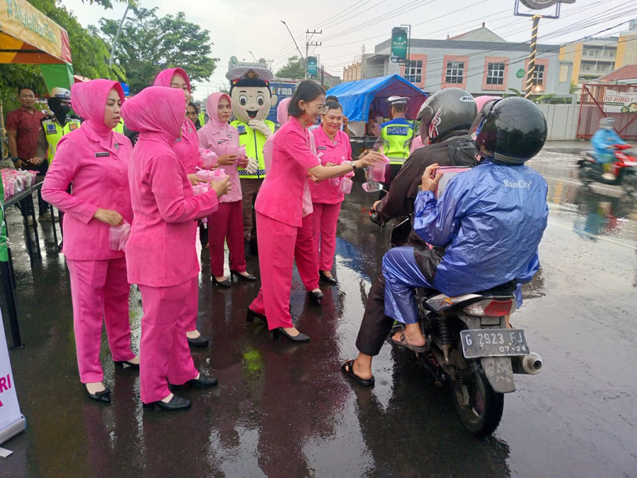 Dibantu oleh jajaran Satlantas dan Satuan yang lain, ibu-ibu Bhayangkari satu persatu membagi takjil kepada para pengguna jalan yang sore itu melintas di jalan kapten Sudibyo mereka nampak senang menerima bingkisan takjil.