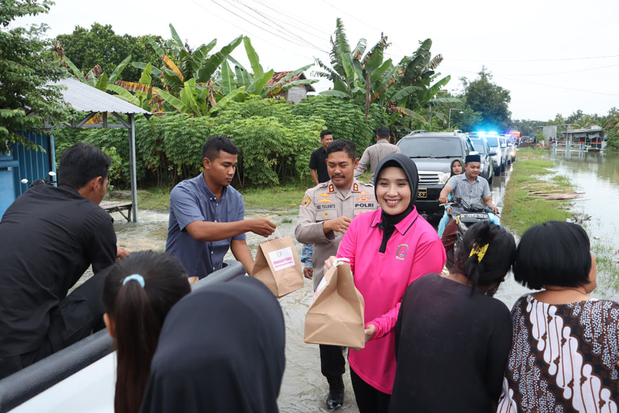 Grobogan-Inspirasiline.com. Kapolres Grobogan AKBP Ike Yulianto bersama Ketua Bhayangkari Cabang Grobogan Ny. Ratih Ike Yulianto turun langsung ke lokasi terdampak banjir di wilayah Kecamatan Gubug dan sekitarnya.